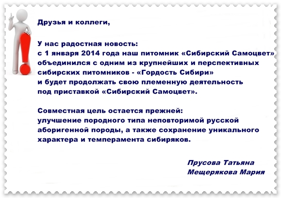 Добро пожаловать на сайт коллективного питомника "Сибирский Самоцвет"! Мы занимаемся племенным разведением и популяризацией сибирской и невской маскарадной породы в России и мире. На нашем сайте Вы сможете поближе познакомиться с сибирскими и невскими маскарадными кошками, котами и котятами питомника; ознакомиться со стандартами сибирской породы от различных фелинологических систем мира; посмотреть огромное количество фотографий наших питомцев – одних из самых лучших представителей сибирской породы, как традиционных, так и колор-поинтовых окрасов, фотоотчеты с Международных выставок кошек; прочитать массу полезных статей: по уходу, содержанию, кормлению, разведению и карьере породистых кошек или задать свой вопрос на нашем форуме; ну и конечно присмотреть котенка истиннорусской породы для себя и своих близких.